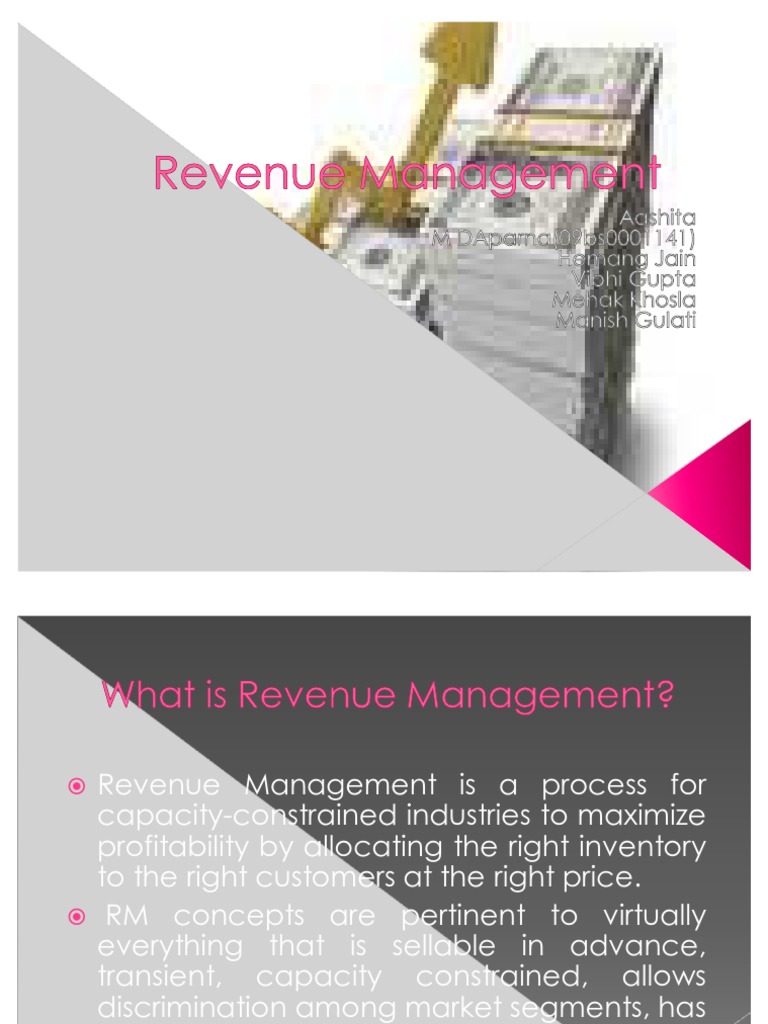 Revenue management is the use of pricing to increase the profit generated from a Most common example is probably in airline ticket pricing Evidence of airline revenue increases of 4 to 6 percent: ... Retrieve Here